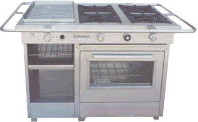 Cocina industrial de 4 hornillas con horno a gas de baja presión en acero inoxidable con parrillas de fierro fundido de 40 x 40 y quemadores de aluminio fundido de 7ö. Combustible: Gas propano a baja presión.