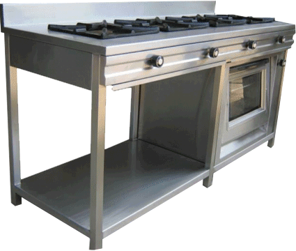 Cocina industrial de 4 hornillas con horno a gas de alta presión en acero inoxidable con parrillas de fierro fundido de 40 x 40 y quemadores de aluminio fundido de 7ö. Combustible: Gas propano a alta presión.