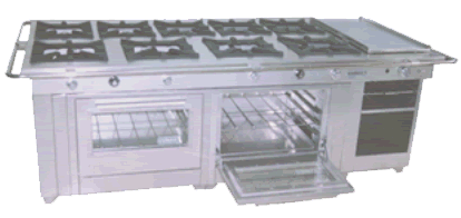 Cocina industrial de 8 hornillas con dos hornos a gas de baja presión en acero inoxidable con parrillas de fierro fundido de 40 x 40 y quemadores de aluminio fundido de 7ö. Combustible: Gas propano a baja presión..